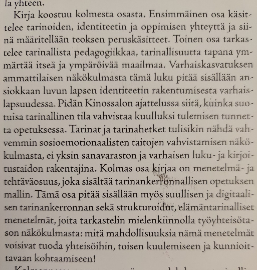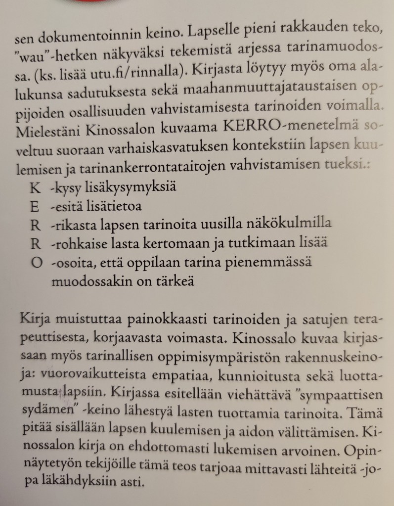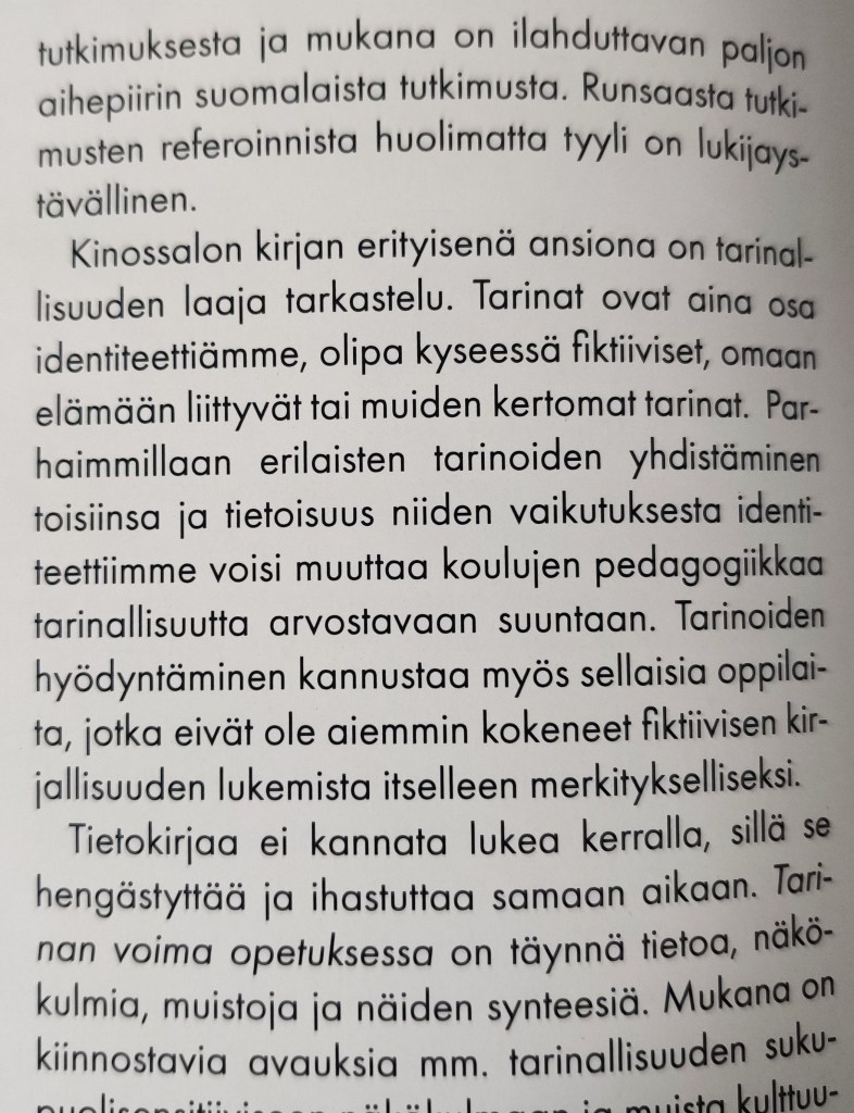 Luulisi siis oman kokemukseni ja koulutukseni perusteella, että tarinallisuus opetuksessa on luontevaa ja jatkuvasti opettajilla käytössä. Kuitenkin tälle teokselle oli kyllä tilaus. En ole aiemmin törmännyt teokseen, jossa tarinallisuutta opetuksessa käsitellään näin monipuolisesti vankan identiteettiteorian kautta. Tarinallisuus ja sen tarjoamat menetelmät ansaitsevat tulla nostetuksi kirkkaammin esille. Kuten Kinossalo sen sanoo, tarinallisuuden käyttö opetuksessa tukee kenen tahansa oppilaan 1) tarinallisia taitoja antaa merkityksiä, 2) rakentaa tarinoita, 3) opetella argumentaatiota sekä 4) muodostaa käsitystä itsestä ja ympäröivästä maailmasta.