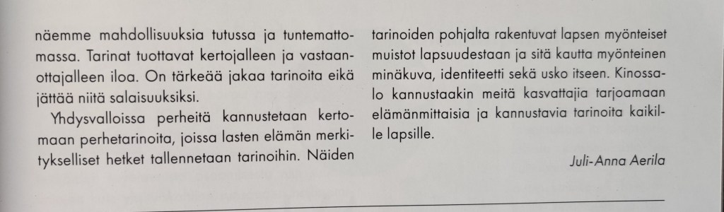 Juli-Anna Aerila, yhdessä Merja Kauppisen kanssa on julkaisst mm. PS-kustannuksella tietokirjat Sytytä lukukipinä – pedagogisia keinoja lukuinnon herättelyyn ja Kirjasta kaveri – Sytykkeitä lukijaksi kasvamiseen. Lisäksi hänellä on alan ansiona tutkimuksia ja dosentuuri sekä mainio ja kattava julkaisuluettelo, joten arvostan hänen sanojaan erityisen paljon. Olen niin kiitollinen, että lukiessani arvioita kyynelehdin, koska se koskettaa. Se on rakentavasti kirjoitettu ja tiedän, että Juli-Anna on samalla, tärkeällä asialla siinä, että tarinallisuus koskettaa meitä kaikkia ja sillä voidaan edistää monin tavoin hyvää. Sain myös hyviä vinkkejä avauksista, jotka eivät olleet minulle ennestään tuttuja.
