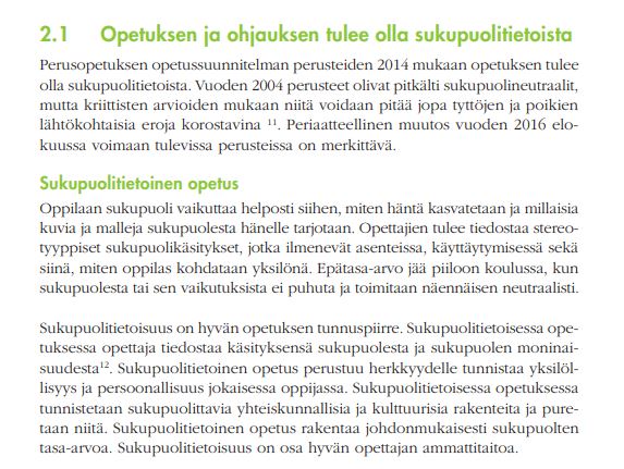 - Opetuksen tulee olla sukupuolitietoista. Jokainen oppiaine edistää sukupuolten tasa-arvoa omalla tavallaan.