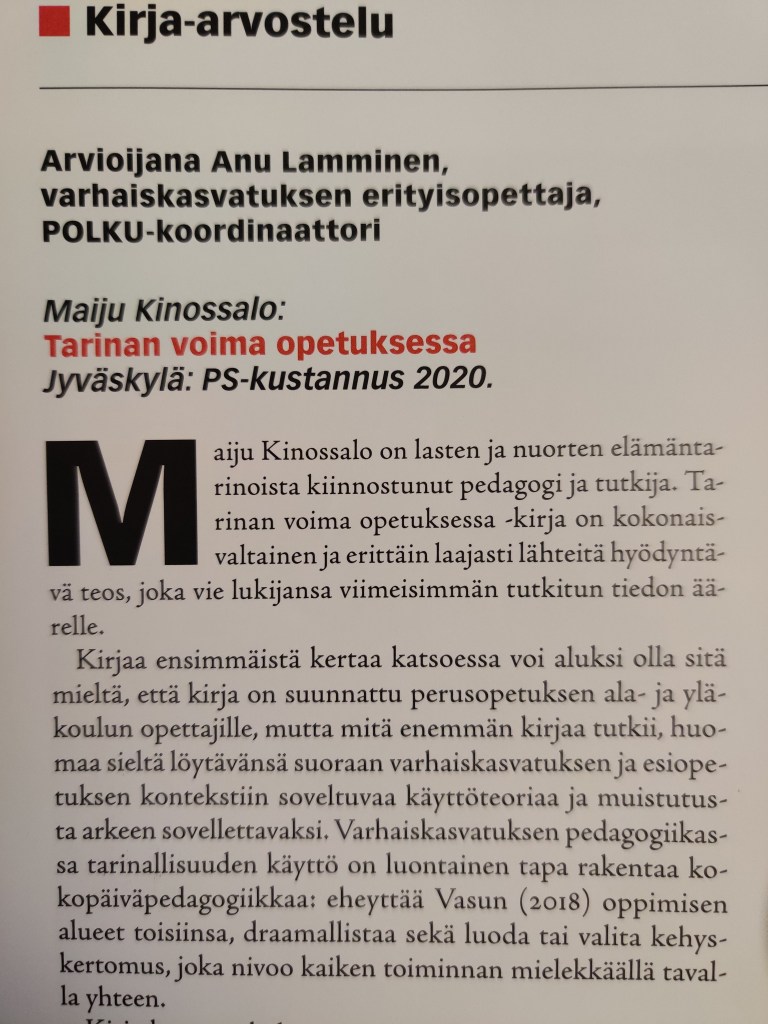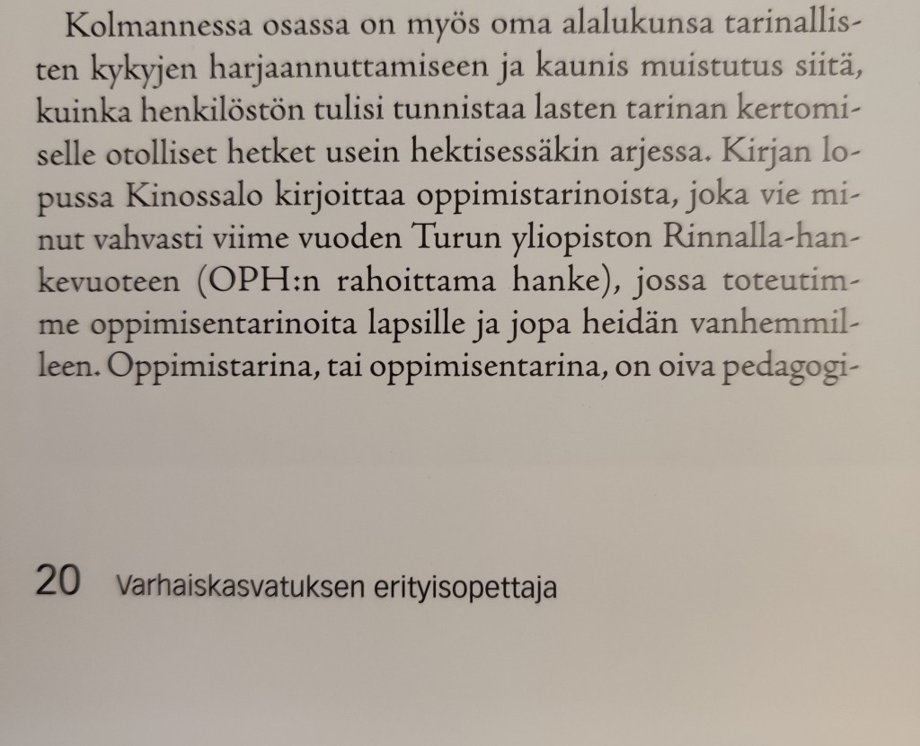 Varhaiskasvatuksen erityisopettaja ja POLKU-koordinaattori Anu Lamminen sukelsi tarinoiden voimaan Turun ja Oulun yliopistojen RINNALLA – Taide- ja kerrontalähtöinen mentoritoiminta lasten sosiaalisemotionaalisten taitojen oppimisen tukijana varhaiskasvatuksessa -hankkeessa sekä varhaiskasvatuksen erityisopettajien jäsenlehdessä kirjoittaen kirjastani kirja-arvostelun. Hankkeesta syntyneeseen kirjaan voit tutustua täällä ilmaiseksi. Suosittelen sitä lämpimästi. Kirja-arvostelun näet alla.