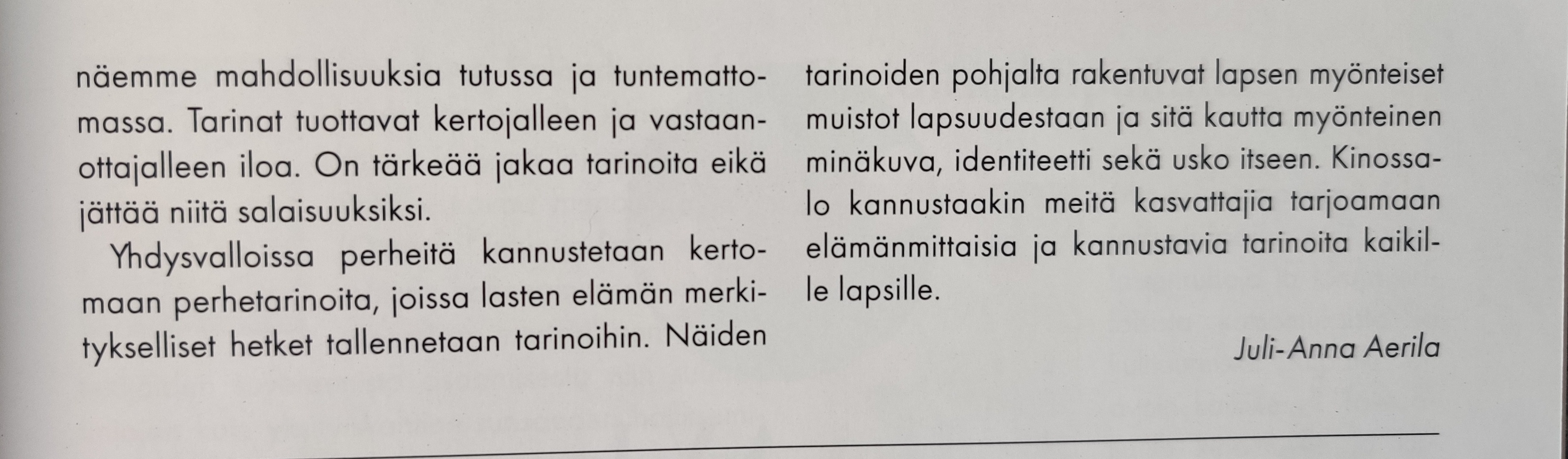 Tarinat ja tarinahetket tulisikin nähdä vahvemmin sosioemotionaalisten taitojen vahvistamisen näkökulmasta, ei yksin sanavaraston ja varhaisen luku- ja kirjoitustaidon rakentajina.