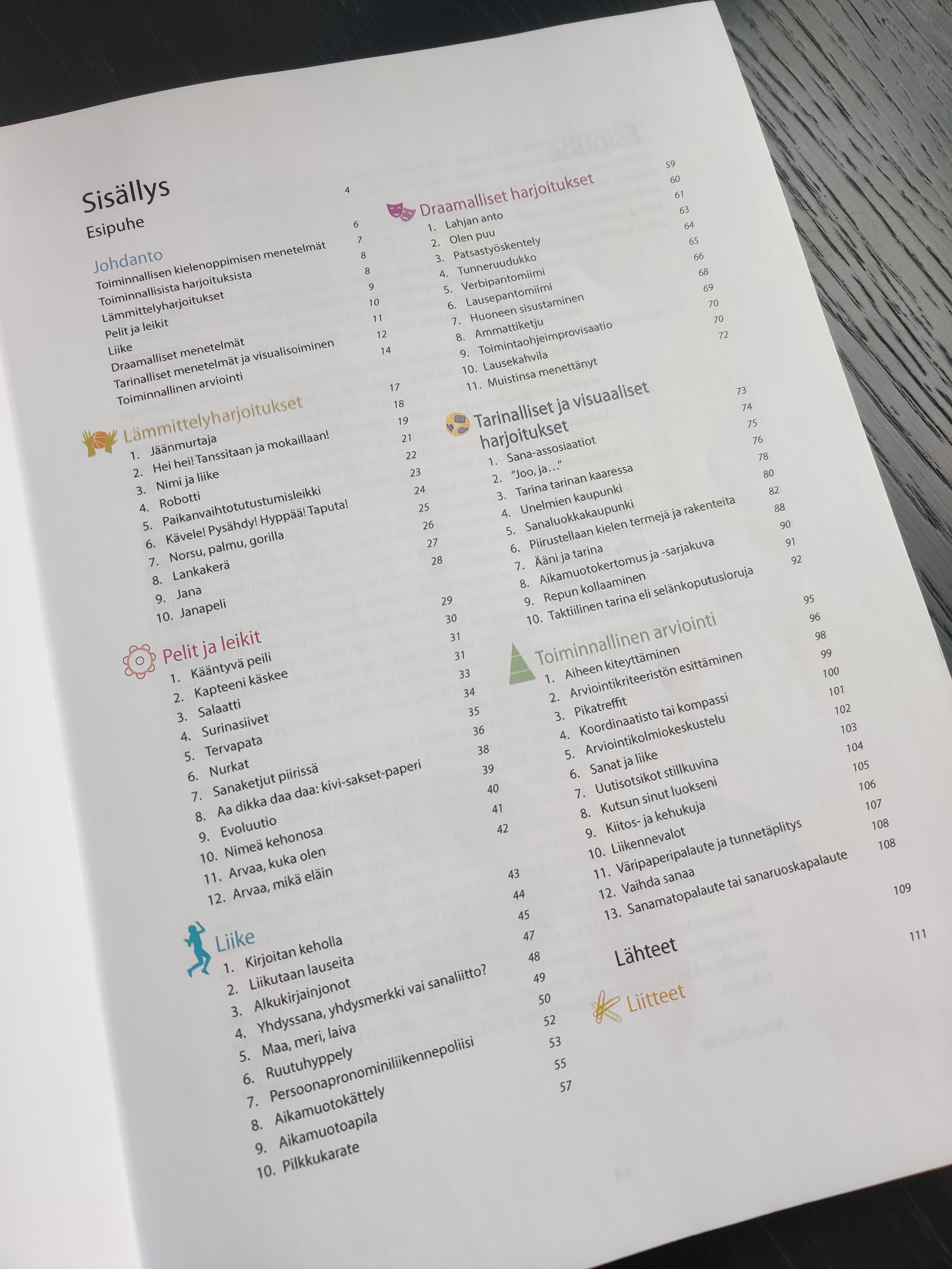 Kirja on pullollaan harjoituksia kielenoppimiseen sen innostavassa, toiminnallisessa muodossaan. Harjoitukset ovat selkeitä, toimivia ja toteutettavissa ja sovellettavissa eri-ikäisten oppijoiden opetukseen. Suunnitelmia lukiessa voi vakuuttua siitä, miten vankalta kokemus- ja tietopohjalta ne on laadittu. Niissä tuntuu toiminta ja se, että niitä on moneen kertaan oikeassa luokkahuoneessa kokeiltu ja jalostettu. Jos joku opettaja haluaa saada toimivia, innostavia ja perusteltuja suunnitelmia kielenopettamisen vaihtoehdoiksi, tämä kirja on aivan ykkönen. Sisältö on runsas ja sen toiminnan kokonaisuudet käsittävät lämmittelyä, pelejä, leikkejä, liikettä, draamaharjoituksia sekä toiminnallista arvioitia. Ilokseni toiminnan osuudessa on merkittävänä kokonaisuutena tarinalliset ja visuaaliset harjoitukset. Kurkkaapa sisällysluetteloon alla olevasta kuvasta. Se on houkuttava. Se on juuri sitä mitä kentällä kaivataan: kokeiltua, pohdittua ja valmiiksi suunniteltua toimintaa eli kokooma menetelmiä, joita voi hyödyntää sellaisenaan oppitunneilla. Ne perustuvat toiminnallisuuteen: kokemuksiin, kehollisuuteen ja kokonaisvaltaiseen oppimiseen, joilla rikastetaan ja pidennetään oppimisessa syntyviä muistijälkiä.