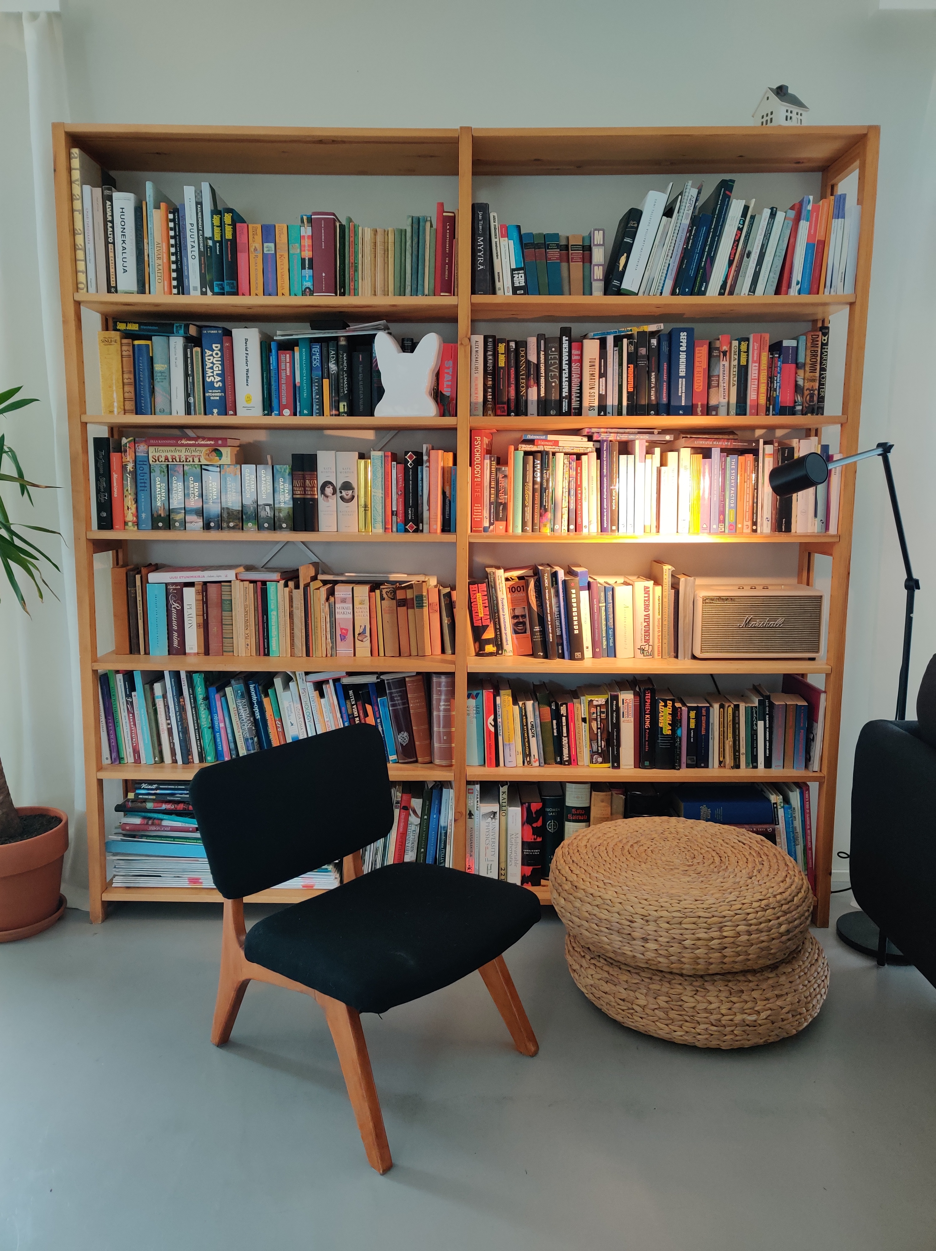 Kirjoilla on meidänkin kodissamme suuri rooli – ja hankin niitä niin uutena kuin etenkin kirpputoreilta ja kierrätyskeskuksista. Muutimme tänne kesäkuussa ja ensimmäisenä tiesin, mihin laitamme kirjahyllyn. Se on keskellä kaikkea. Aika houkutteleva, vai mitä? Millaista tietoa, maailmoja ja mielikuvitusmatkoja tämä hylly tarjoaa?