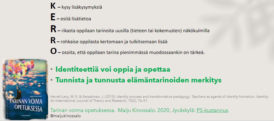 Kotona, varhaiskasvatuksessa, koulussa ja nuorten parissa identiteetin rakentumista voi tukea monin tavoin. Oman elämäntarinan monipuolista muotoilua voi harjoittaa vuorovaikutuksessa arjen pienissä hetkissä, mutta siitä voi tehdän myös laajempia elämää koskettavia teemoja kasvun eri paikoissa. Yksinkertaisinta on ensinnäkin tarjota kasvavalle ihmiselle runsasta kielellis-sosiaalista kasvuympäristöä, puhua kokemuksista yhdessä, ja toiseksi elämää voidaan tarkastella katsoen menneestä tulevaan esimerkiksi elämänkaaren tai aikajanan avulla. Puhutaan myös elaboratiivisesta muisteluympäristöstä, joka perustuu pitkittäistutkimuksiin. Kirjassani olen suomentanut ja mallintanut sitä KERRO-menetelmäksi.